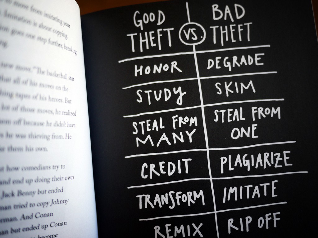Austin argues that creative work builds on what came before, and thus nothing is completely original. He advises us to look at the things this world has as either worth stealing or not worth stealing. Steal the things that will help make you (or your business) stand out. The author adds that he does not mean ‘steal’ as in degrade, skim,imitate or rip off — but study, honor, remix, transform and credit.