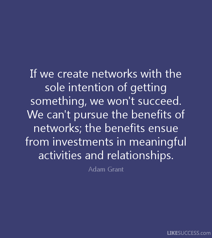 Takeaway: Mentor with the right intentions. Build your networks by creating value without expectation. Be generous with your time and resources and when you need help it will be there (don’t be afraid to ask for it). Adam Grant’s quote from Give and Take describes this perfectly.