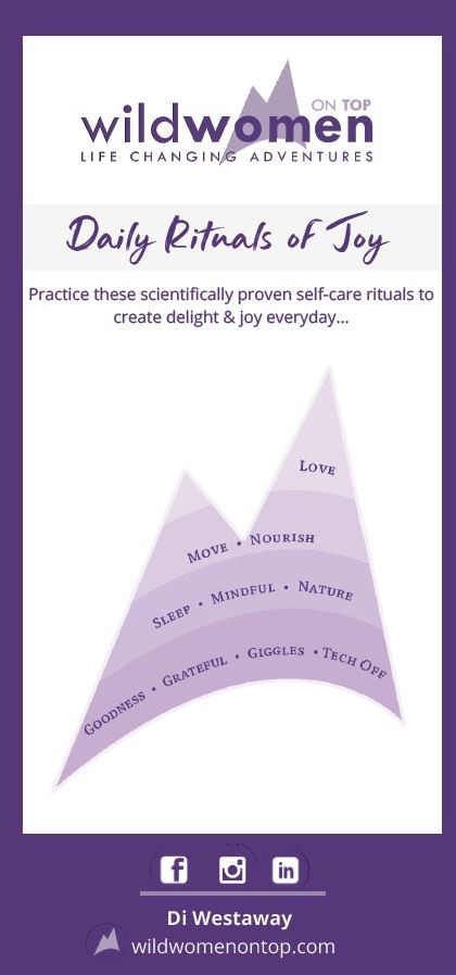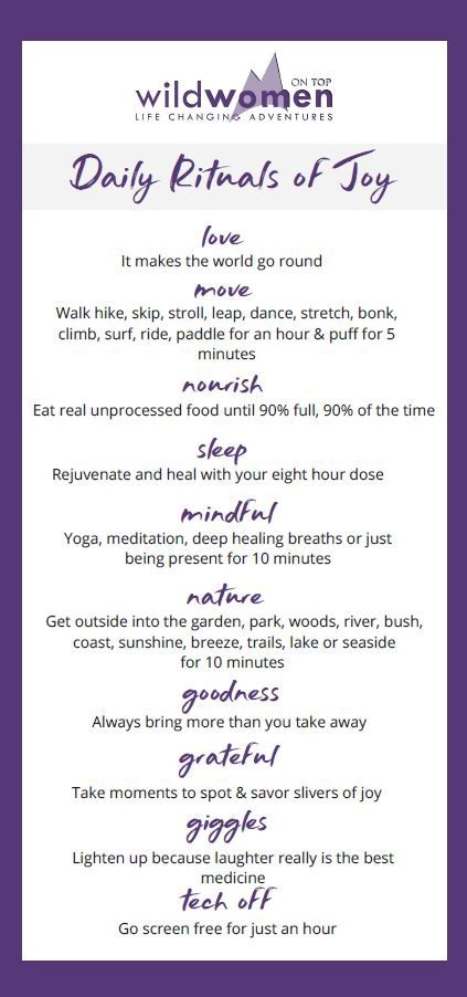 The best daily practices for joy include loving, moving, nourishing, sleeping, mindfulness, nature, goodness, gratefulness, giggles and tech-off. I call these the Daily Rituals of Joy and a hike with friends can ignite them all.