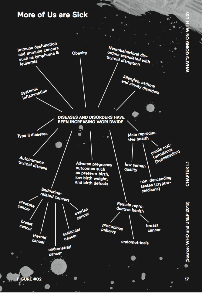 Pediatric health trends have attracted concern. Figure #01 (above) provides a variety of statistics based on reports by leading organizations such as the World Health Organization (WHO) and United Nations Environment Programme (UNEP), the President’s Cancer Panel (PCP), the Endocrine Disruption Exchange, the US Centers for Disease Control and Prevention (CDC), and the Children’s Environmental Health Center at Mount Sinai Hospital (CEHC).