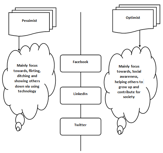 Above — Technology usage structure, clearly describes and categories the usage and objective of pessimistic and optimistic kind of people. Optimists are more concerned about self-respect and dignity, while pessimists are less concerned about society and dignity.
