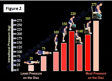 The least amount of pressure is measured with the patient lying supine. The highest disc pressure is measured while sitting and leaning forward 20° with a 20 kg load in their arms (Figure 2).