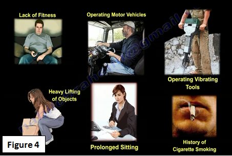 There are many different physical factors that can attribute to low back pain including lack of fitness, heaving lifting of objects, operating motor vehicles, prolonged sitting, operating vibrating tools, and history of cigarette smoking (Figure 4). Holding loads close to the body is important to help reduce compression forces on the lumbar spine. Smokers has a higher risk of low back pain because nicotine can cause disc degeneration.