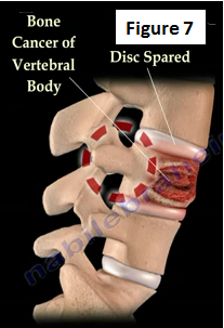 Bone cancer of the vertebral body may also occur (Figure 7). Some of the factors that may be associated with bone cancer are people over 50 years of age, pain at rest and night, unexplained weight loss, and a history of cancer. Bone destruction involving the pedicle is pathognomonic.