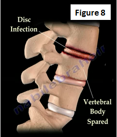 An infection in the vertebral body (discs) may also be a factor contributing to low back pain (Figure 8). The infections can occur due to diabetes mellitus, fever, intravenous drug abuse, urinary tract infection, and previous surgery.