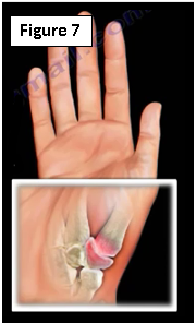 Rheumatoid arthritis is pain located at the knuckles of the fingers and wrist bone on the side of the small fingers (Figure 4). Inflammation or irritation causes pain, swelling, weakness, and overtime, there will be a loss of the normal shape and alignment of the joints. The joints between the hand and fingers swell and move upward (dorsal subluxation). Tendons over the joints slip and cause the fingers to bend towards the little finger (ulnar drift).