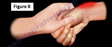It may be difficult to differentiate between De Quervain’s syndrome and basal thumb joint arthritis. The Finkelstein’s test is conducted by having the patient make a fist with the fingers closed over the thumb and the wrist is bent towards the little fingers. The hand is pulled so that the involved tendons are stretched, causing sharp, local pain if injury and inflammation are present (Figure 8).