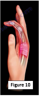 Flexor Tenosynovitis (Kanavel’s signs) causes pain that is located in the finger at the flexor tendon sheath (Figure 10). There are four Kanavel cardinal signs including uniform swelling of the entire finger, the finger is flexed, intense pain when attempting to straighten the finger (occurs early) and tenderness along the course of the tendon sheath. These signs usually indicate an infection of the tendon sheath. Antibiotics and surgery may be necessary to treat this infection.