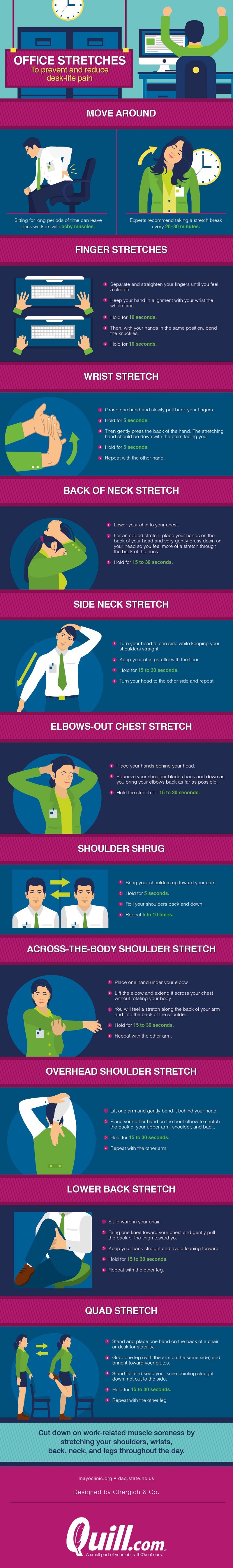 Office stretches to prevent and reduce desk-life painInfographic by Quill