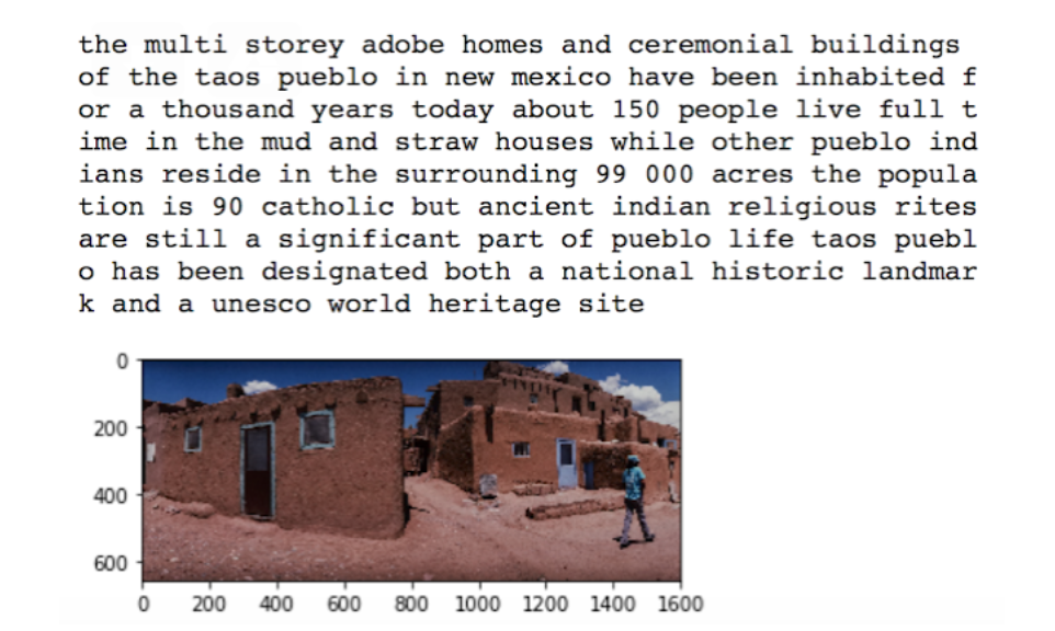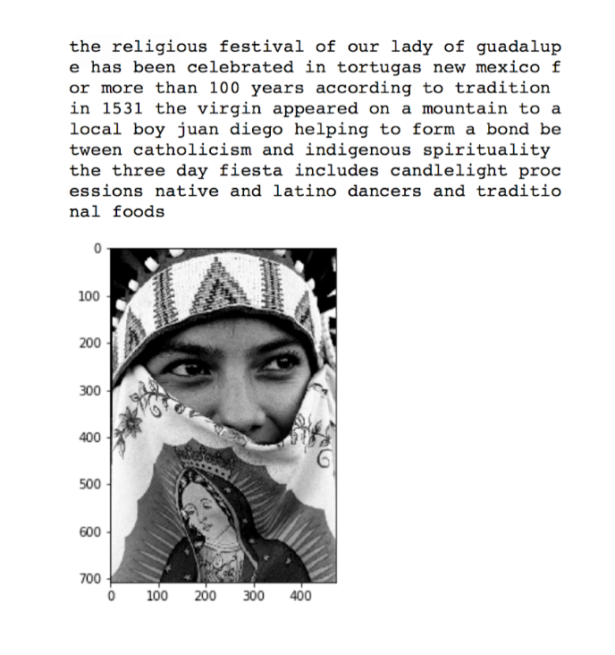 The first step in creating a culturally sensitive story based on a photo is coming up with tags for the image. Those can be explicit to the specific culture and event being depicted: Indo-Hispanic, dance, feathered costume, headpiece, Festival of Our Lady of Guadalupe, etc. Those tags can be combined to start the caption-making process. We first trained our deep learning model with thousands of generic images to help it to come up with sensible captions. These are some real caption examples that our Deep Learning model produced for the given images –