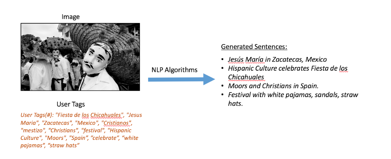 We will use natural language processing algorithms to generate short sentences, using tags provided either by the user or generated via automated AWS services. Here is an example that shows how tags can be converted into brief sentences.