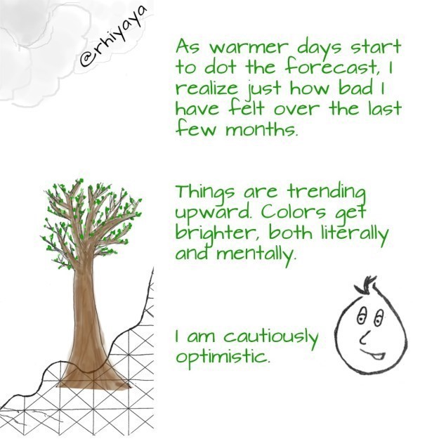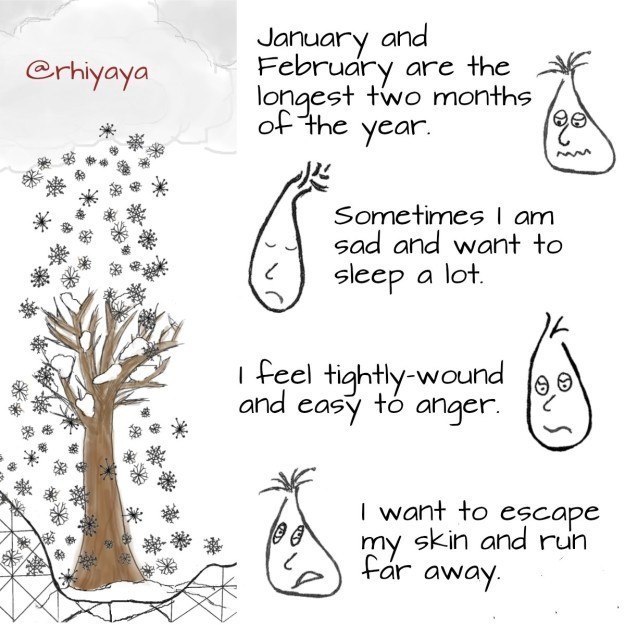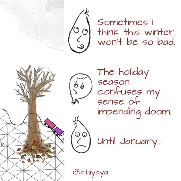 If you deal with Seasonal Affective Disorder you might find yourself in some of these drawings. Or maybe your roller coaster has bumps and dips at different places. Either way, it’s winter and we are the people on the after-ride photos looking like they’d rather be anywhere else.