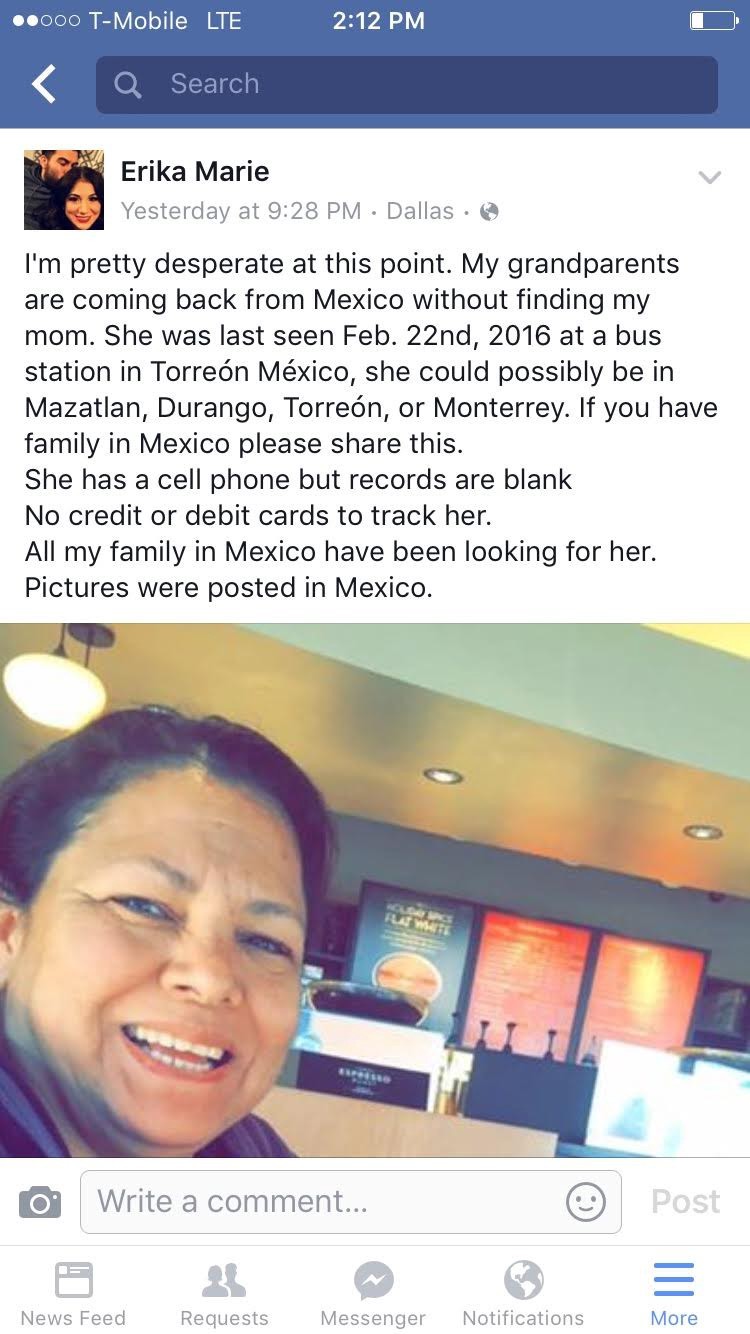 My grandparents probably visited Mexico 5 times to look for her during the 7 months she was gone. My family’s visits to Mexico consisted of visiting police stations, bus stations, news stations, and posting missing person reports. We got a lot of calls and many of them were fake or requested money.