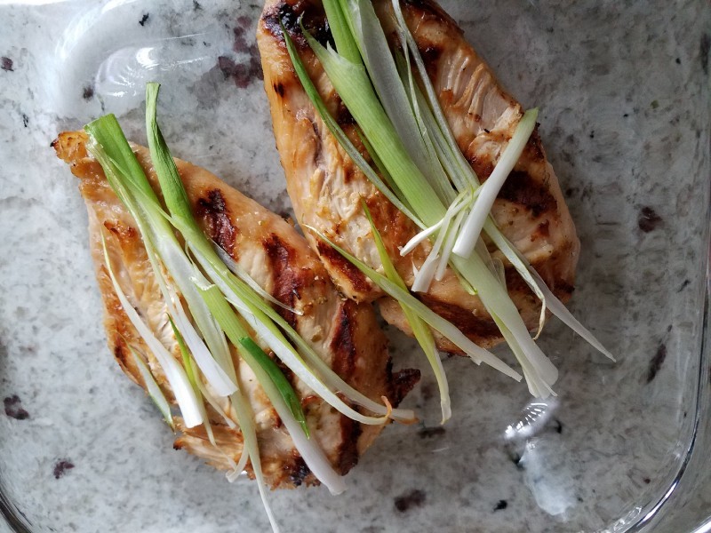 After turning the chicken breast, place a scallion sliced the long way so it sort of fans out. Let the second side finish.