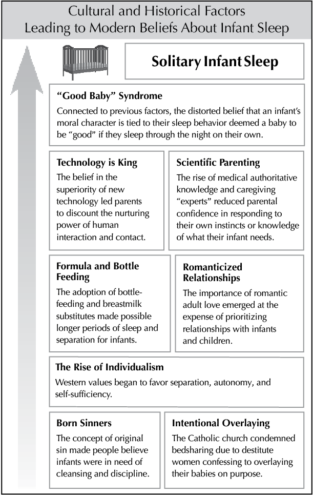 This historical and cultural context makes it easier to understand why it was assumed that early nighttime infant separation from the parents was necessary to produce happy, confident, emotionally healthy, independent future adults, alongside magnificently energized parents. Without any anthropological or biological studies, which would have cast serious doubt on these assumptions, separate sleep spaces and controlled bottle-feeding were promoted.