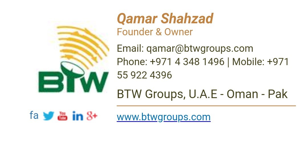 The idea of a company which is started from the basement of a restaurant has took the form of a huge business firm is the brain child of Mr.Qamar Shahzad, a young man who started his journey with big dreams in his eyes and a solid confidence in his abilites. He has proven his mettle by making mark in the business world by expanding his firm into various company ventures to He has established many ventures in Middle East and He is also the owner of BTW group in Dubai, Pakistan and Oman. He is basically into telecommunication service sector and their services include General trading, Technical Services and Networking ,etc. He has achieved a lot in his young age with sheer persistance and perseverence to make a mark for himself in the highly competitive world of business.He possesses the qualities and the capability of a successful business entrepreneur spirit and high results.