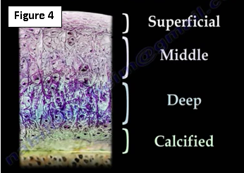 Normal articular cartilage, also known as hyaline cartilage, provides a smooth crystal clear gliding surface to aid in the motion of the joints. The structure of hyaline cartilage is divided into four layers: the superficial, middle, deep, and calcified layer, with the calcified layer representing a transition from articular cartilage to bone (Figure 4). This cartilage is designed to achieve and maintain proper function over the majority of a person’s life. If the cartilage is subjective to excessive weight, overuse, improper alignment, or injury it begins to wear away leaving bone to rub on bone.