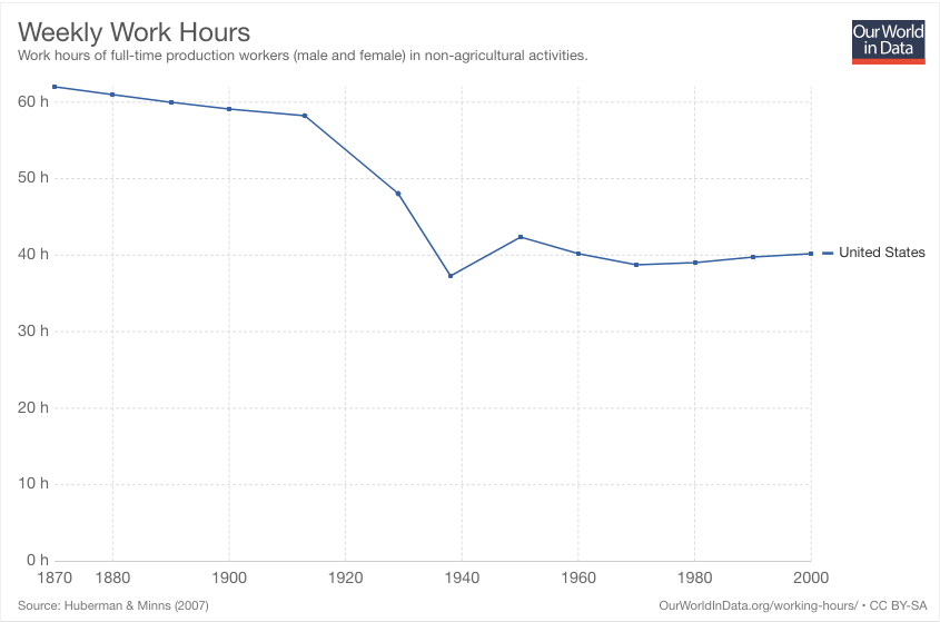 Ever since, despite polemics from the likes of Bertrand Russell against the tyranny of work and Keynes’ promise of 15-hour workweeks, or Tim Ferriss’ “4-hour workweek”, the proportion of our lives spent merely working remains, on aggregate, unchanged.