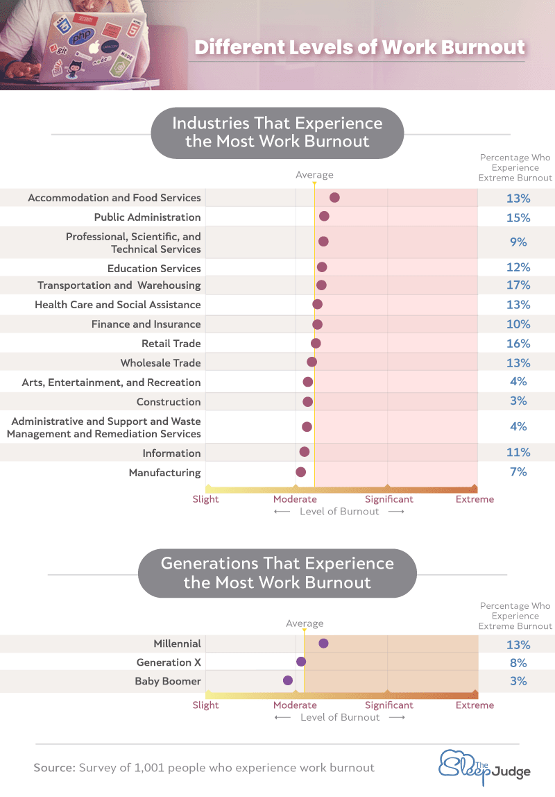 Those working in accommodation and food services averaged the highest burnout while others in public administration, professional and education services, and transportation and warehousing were tightly behind. Seventeen percent in transportation and warehousing reported suffering extreme burnout, the highest out of any profession, followed by retail trade (16%) and public administration (15%).