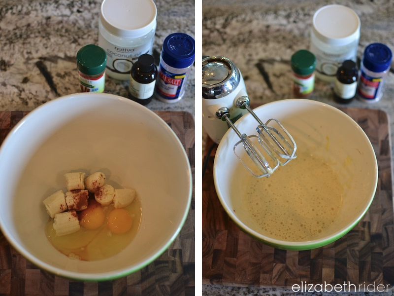While the pan preheats, mix your ingredients into a smooth batter. I use a hand mixer because I find it easy, but you can use a blender, mixer or do it by hand by mashing the banana really well then mixing in your ingredients. Regardless of the method, mix until well combined, about 30–60 seconds, but don’t whip too much air into it (eggs will eventually whip up into foam if you let it go too long).