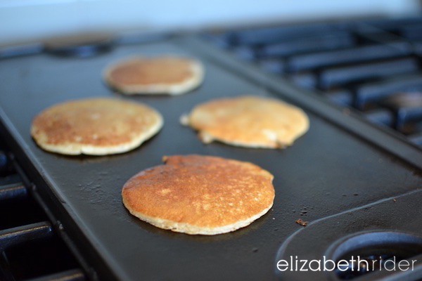 Add about 1/2 teaspoon coconut oil to the pan and spread it around with your spatula right before you add the batter. Don’t preheat the oil with the pan because it will get too hot. Grape seed oil or macadamia nut oil can work too, but olive oil doesn’t have a high enough flash point and will smoke too much. Coconut oil is healthy, can withstand high heat, and adds a very light yummy flavor to the pancakes so it’s my oil of choice here. *Per The American College of Allergy, Asthma & Immunology: “Coconut is not a botanical nut; it is classified as a fruit, even though the Food and Drug Administration recognizes coconut as a tree nut. While allergic reactions to coconut have been documented, most people who are allergic to tree nuts can safely eat coconut.” If you’re concerned with a nut allergy use grape seed oil.