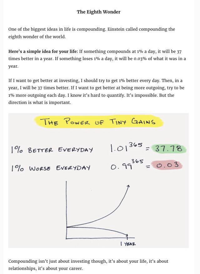 - Take small steps just 1% improvement each day is going to make you 37 times better in a year versus 1% worse each year results in 0.03 times worse…