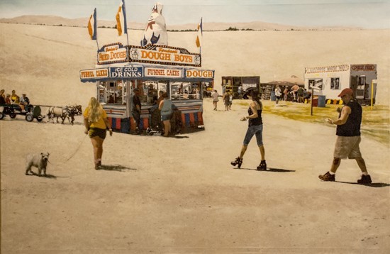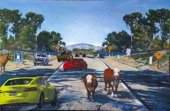 The couple have been collaborating on paintings for the past three years while continuing to pursue their own individual work. They plan trips across the country, to research and accumulate images. One of their works entitled “Natural Gas” holds a two-fold meaning. Concerned about global warming and climate change during the drought, they decided to incorporate it into their art. They wanted to reference specific images to create a composition, so went on a drive towards Santa Paula from Ventura (on the126). “We needed cars and typical California road congestion along with specific traffic signs. (such as: ‘Natural Gas’…merging traffic and bicycle lane). We also needed cows because of their methane gas contribution to the atmosphere. The idea is for our paintings to reflect Americana, to be ironic, while funny and poignant,” said Marjorie.