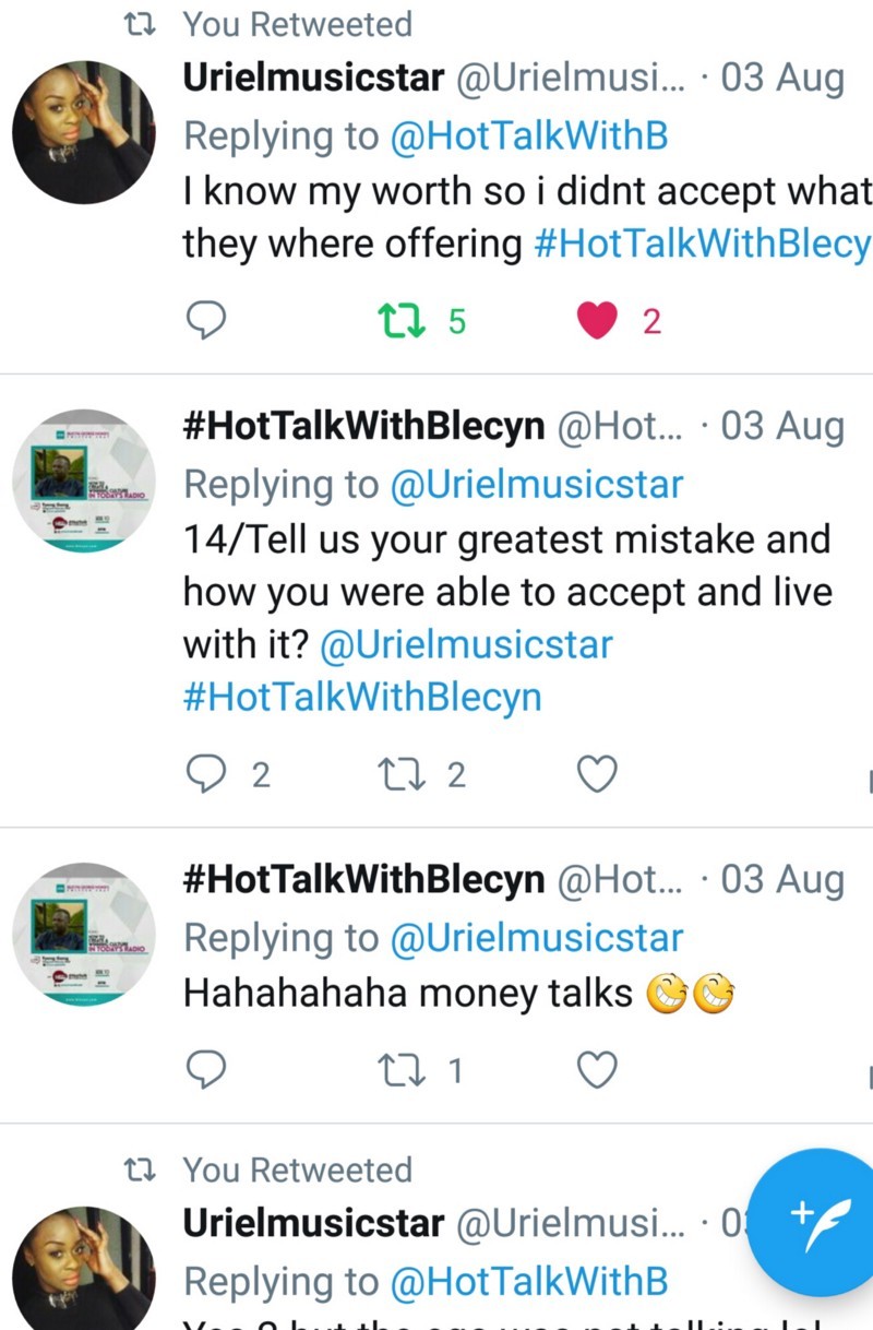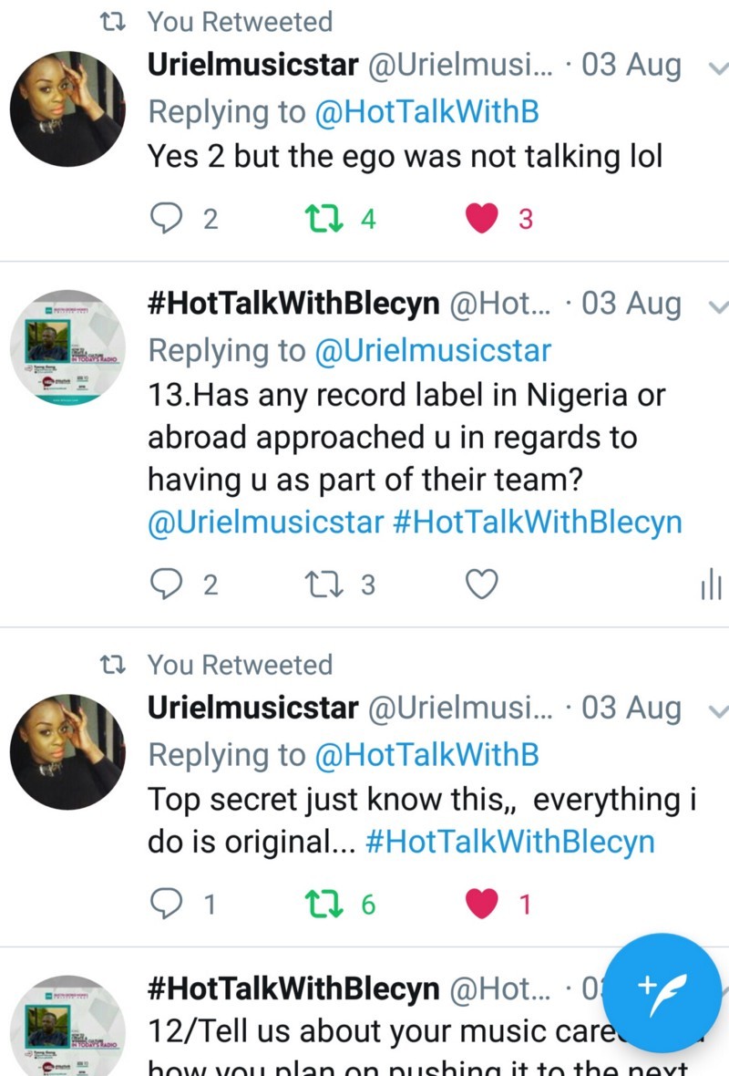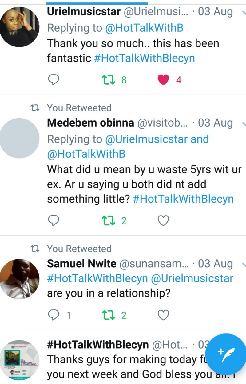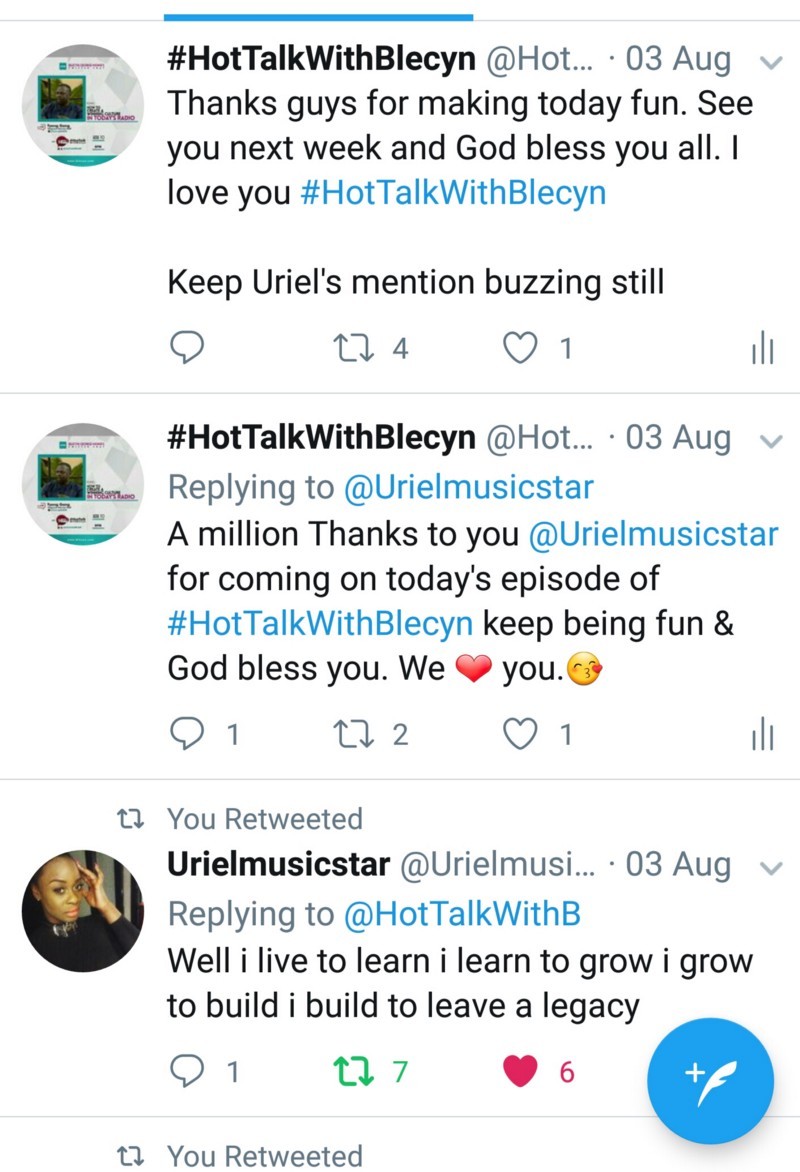 BGM: A million Thanks to you @Urielmusicstar for coming on today’s episode of #HotTalkWithBlecyn keep being fun. God bless you.