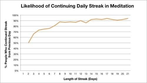 If you have never meditated, you should keep your sessions short at the beginning, about one-three minutes. Again, consistency is more important than results. If you maintain two-minute meditation sessions for 11 days in a row, your chances of developing a lasting meditation habit skyrockets to 90%.