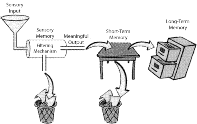 Information moves from Sensory Input (sight, sound, touch, etc.) through Sensory Memory and Short-Term Memory and eventually into Long-Term Memory.