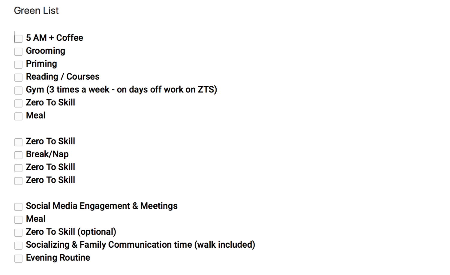 Well, since the majority of the tasks are kind of repetitive no matter what your goal might be, here you want to put them on the list, and sequence them based on how they come within the day, starting from the morning, all the way until you hit the pillow.
