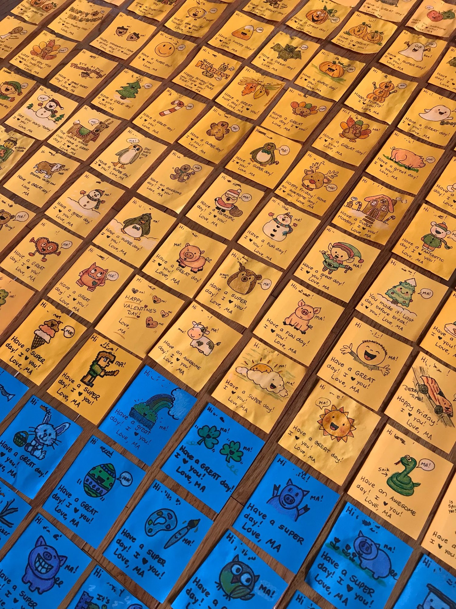 It wasn’t always easy to think of what to draw for each note. Sometimes I cheated and traced something or used a favorite cartoon character. Once in a while I substituted with a sticker. I kept the words short, simple, and easy to read, and now I know that everything I did was worth the effort.