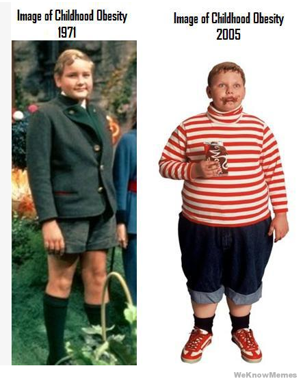 The Augustus Gloop of 1971, once a the picture of childhood obesity, is not fat enough for today’s standards.