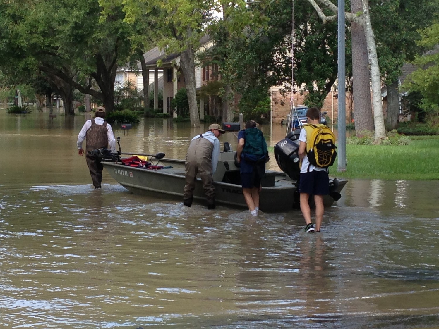 We did have a major victory Saturday. We successfully accessed our house and verified that the second floor stayed dry! Some amazing volunteers have come to our neighborhood with boats to help out. We were able to drive to a street about four blocks from our house and connect to some of these volunteers. My husband and oldest son put on life vests and backpacks and took a boat ride to the house. The boats needed motors to navigate the current — canoes and kayaks are not safe. Following the path of the streets, the pilots had to carefully avoid hitting submerged vehicles, trash, mailboxes, etc.