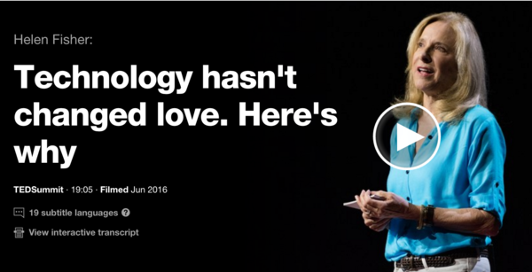 So how much has technology changed love? Helen Fisher argues in her TED Talk, not that much. But what has changed is the culture surrounding love. How we pursue it, our expectations, and even the markets around love.