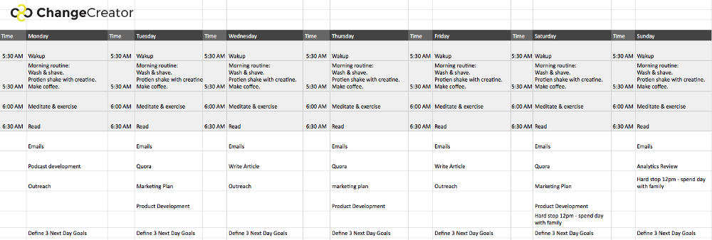 Here’s how I plan out every day of the week — notice I make time to sharpen my mind, nourish my body, and taking action to grow my business: