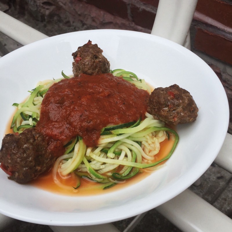 The “Spaghetti” & Meatballs features zucchini noodles with grain-free meatballs, tomato sauce and broth (hold the Parmesan cheese for dairy allergies).