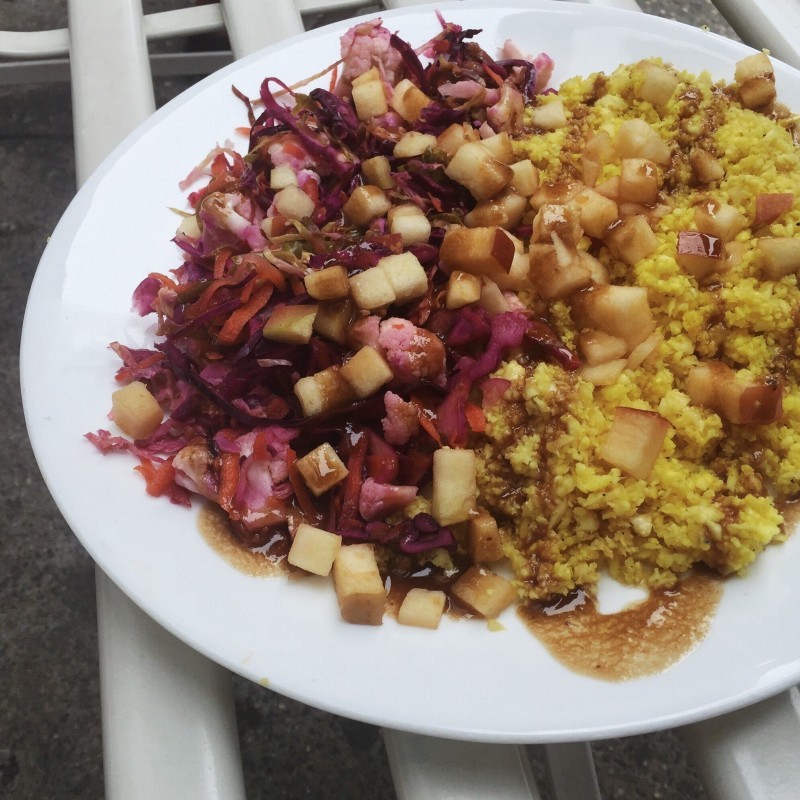 The Wild Bowl was made with turmeric cauliflower rice, brussel sprout-cabbage-carrot slaw, apples and broth!