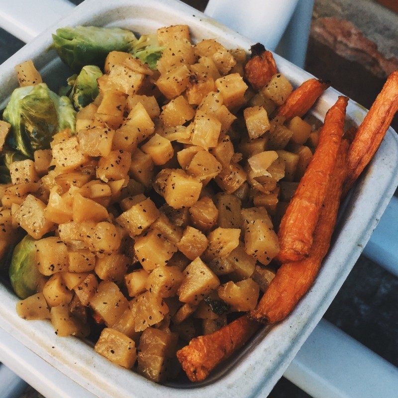 And the delicious vegetables featured were Braised Organic Kale, Roasted Brussel Sprouts, Herb Roasted Rutabaga, Sweet & Spicy Broccoli and Carrot Fries. And for dessert we all had a small bite of chia pudding and the raw brownie balls.