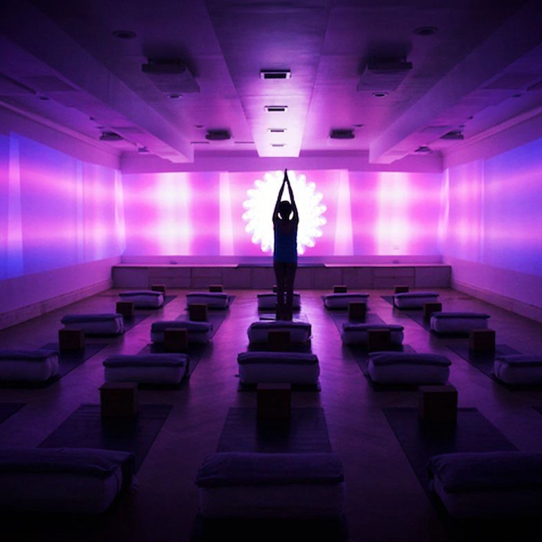 The woom is completely white; bulsters, mats and blankets are provided and after a blindfolded meditation, you open your eyes to the sights and sounds of the room which is filled with projections of colors, constellations and movement. The class ended with a blindfolded shavasana complete with aromatherapy and stillness that we needed to restore our bodies after moving them so much and so hard only a few minutes previously in class.